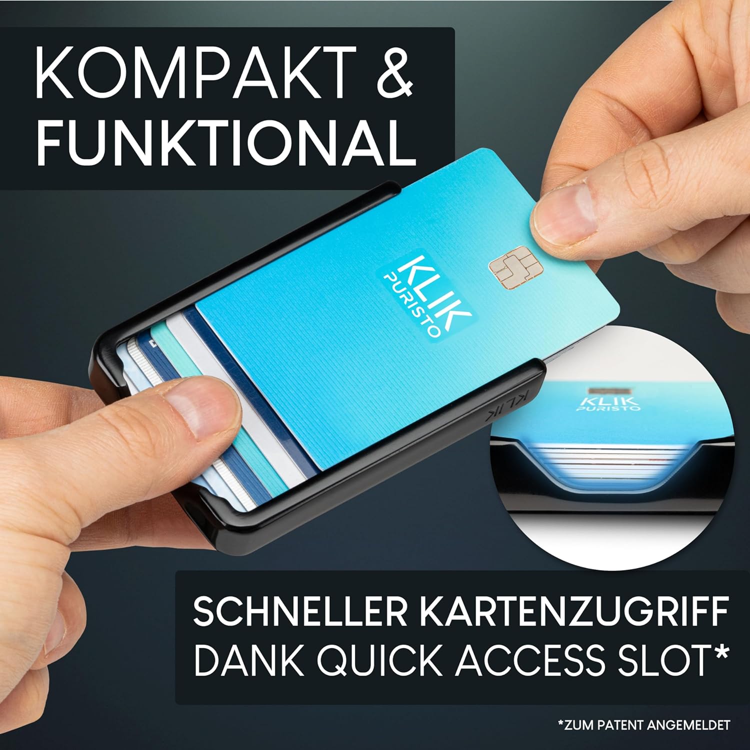 Kaum grösser als der Inhalt selbst – der Puristo KLIK im eleganten Alugehäuse bietet Platz für bis zu 12 Karten. Das smarte Design ermöglicht es, Noten und Belege problemlos und ungefaltet im Front-Etui zu verstauen. Zusätzlich sorgt das micro Magnet Münzfach für eine praktische Lösung, um 1 bis 3 Münzen sicher und bequem zu verstauen.