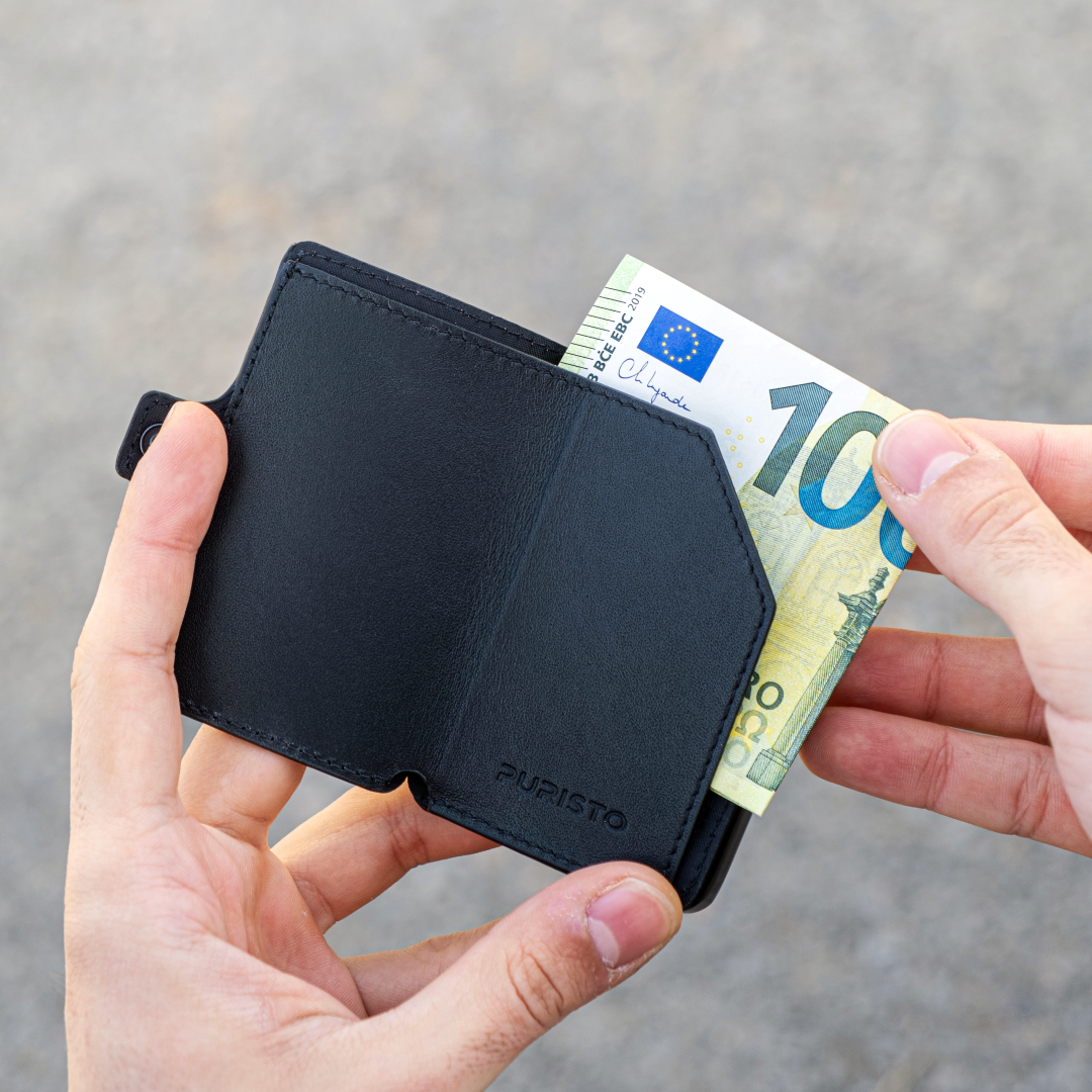 Minimalismus trifft auf Innovation. Kaum grösser als der Inhalt selbst – der Puristo KLIK im eleganten Alugehäuse bietet Platz für bis zu 8 Karten. Das clevere Design lässt dir genügend Raum, um das Wesentliche sicher zu verstauen, ohne unnötigen Ballast mitzuschleppen. Auf der Frontseite des Etuis kannst du zusätzlich Noten gefaltet unterbringen.